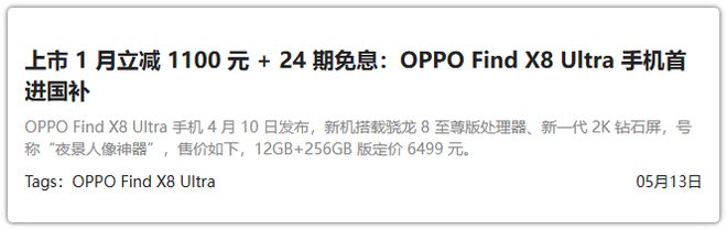 点击次数: /index.html5月13日,各大数码论坛突然传出消息,OPPO Find X8 Ultra某东自营减 100元,叠加PLUS立减500元和500元国补后/,价格直接杀到了5399元。